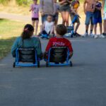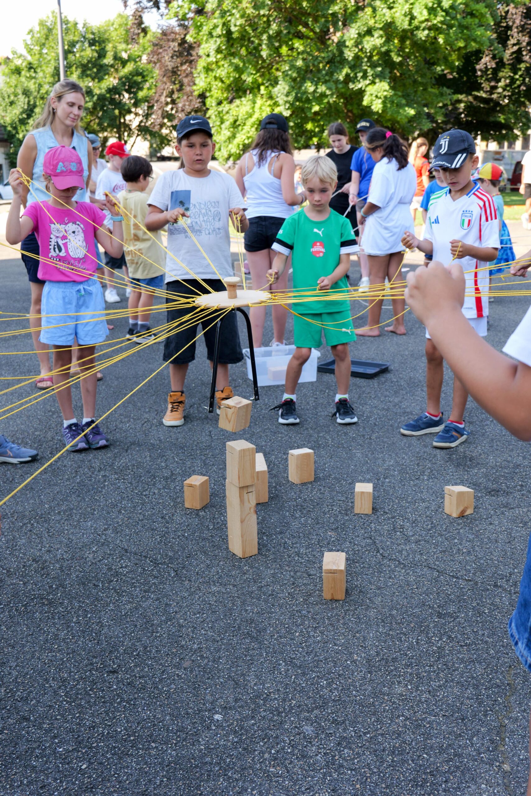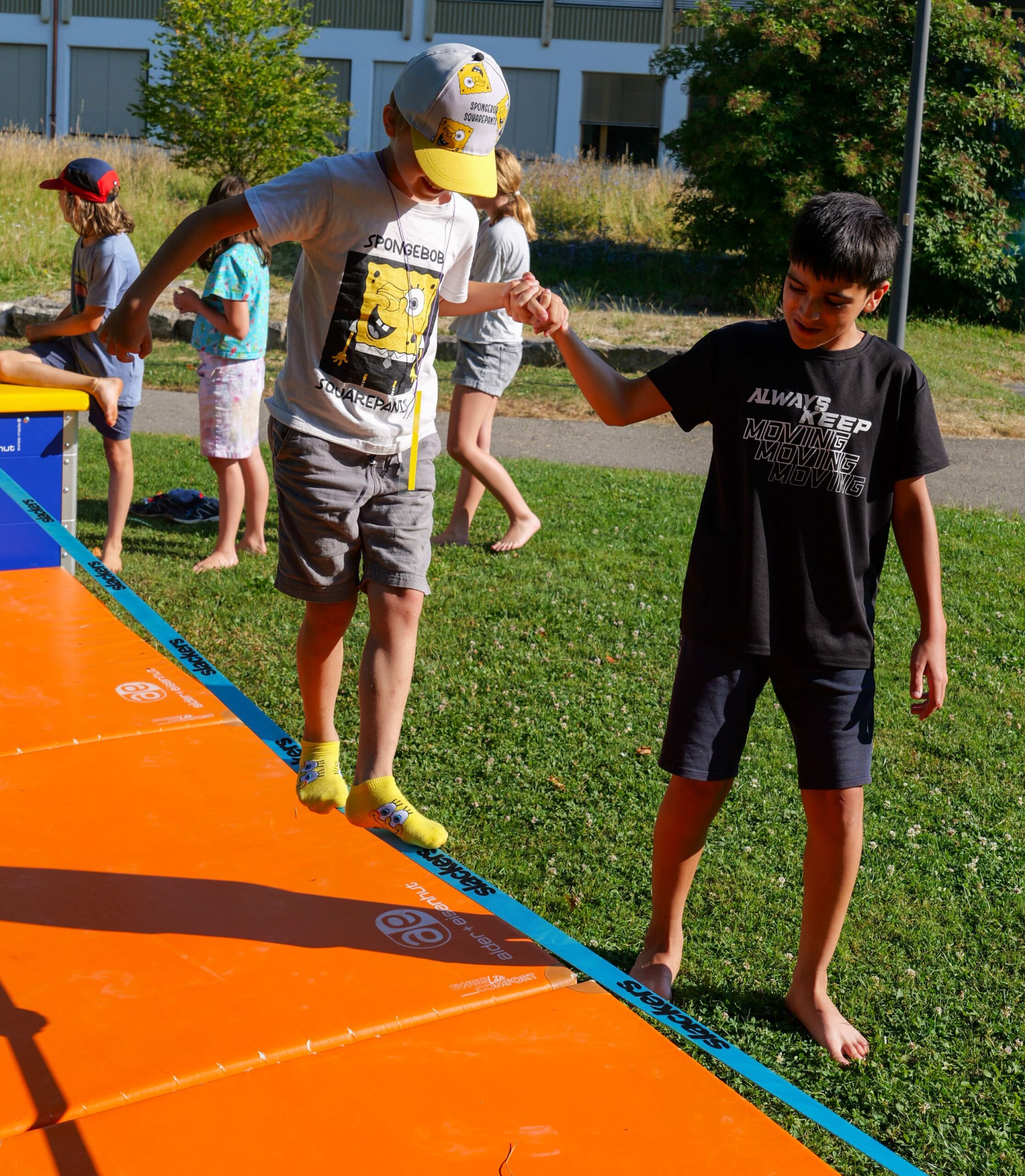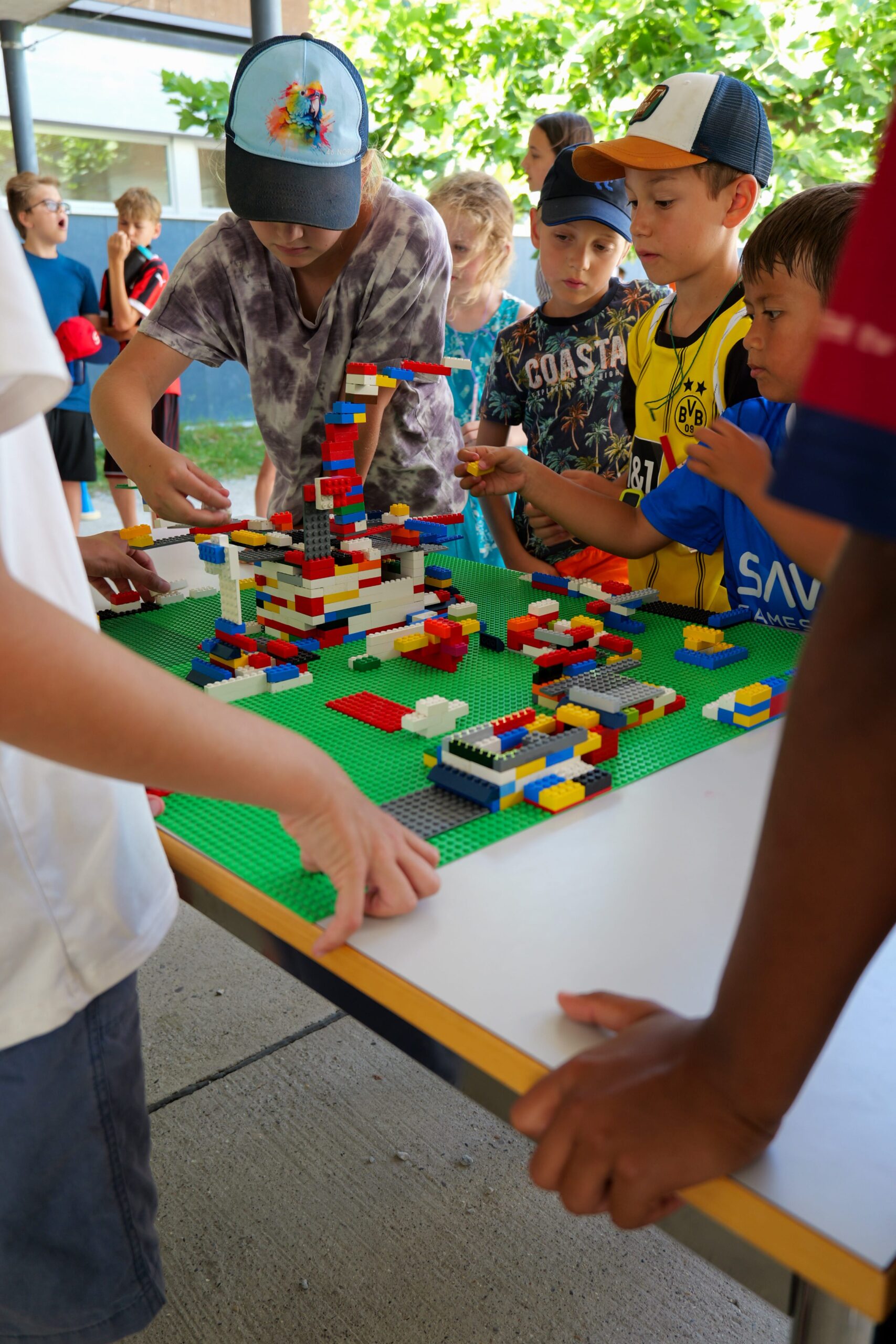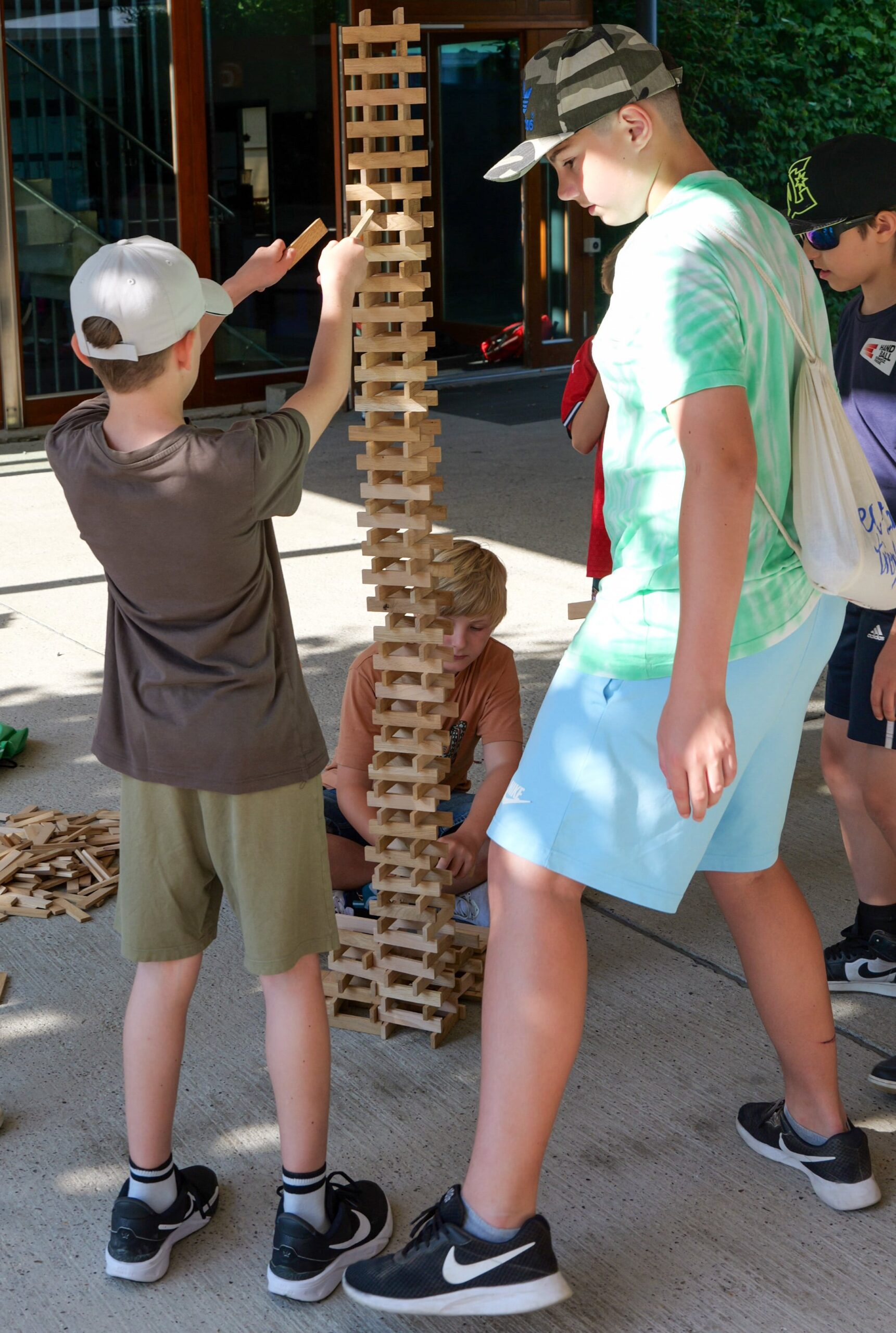 Klassengemischte Gruppen – vom Kindergarten bis zur 6. Klasse konnten am Dienstagvormittag an 18 verschiedenen Posten ihr Können und ihren spielerischen Ehrgeiz unter Beweis stellen. Beim Ski-Wettlauf oder Seilziehen, an der Schokokuss-Wurfmaschine, beim Riesenmikado, beim Boccia oder auf der Slackline konnten die Gruppen gemeinsam Punkte erspielen, die danach in Legosteine umgetauscht werden konnten.