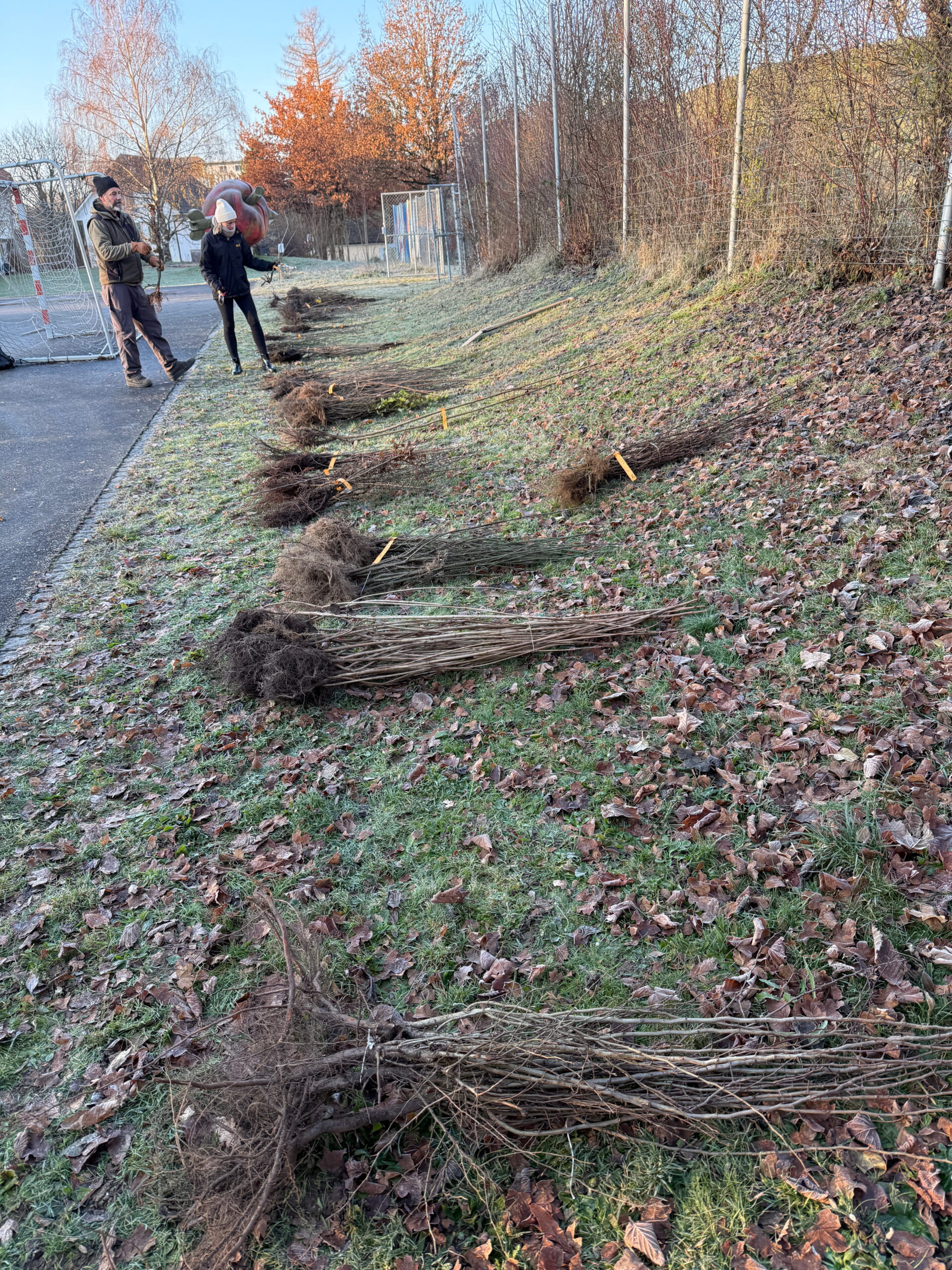 Da die Sträucher wurzelnackt gepflanzt werden, musste dies im Spätherbst umgesetzt werden und konnte nicht bereits im Sommer während der Projektwoche erfolgen.